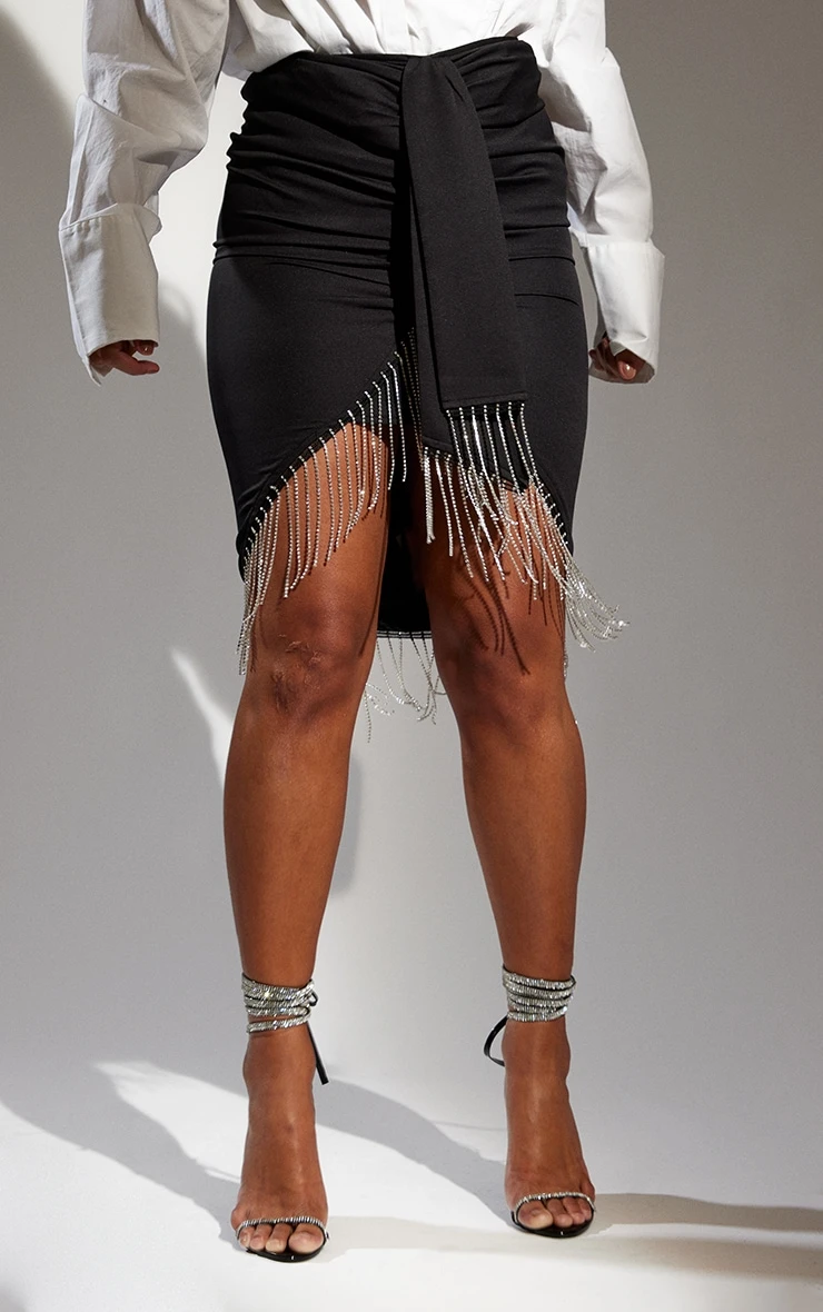 Your new glam piece has just landed doll. Featuring a black woven material with a sequin tassel detailing, a midi length and a flattering fit, we are obsessed. Pair with a white shirt, high heels and statement accessories for some extra styling points.