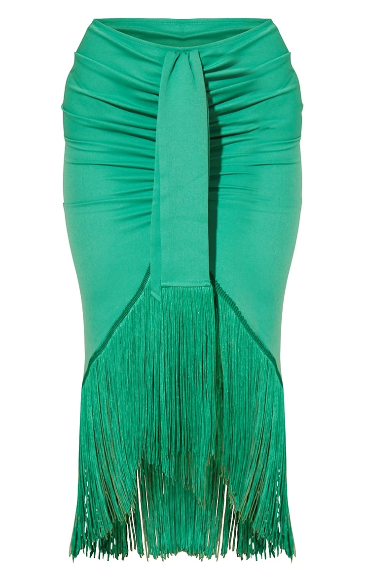 Get ready to have all eyes on you with this skirt. Featuring a bright green material with a tassel hem design and a midi length. Style with a crop top and green slip-on heels for a combo we’re crushing on.