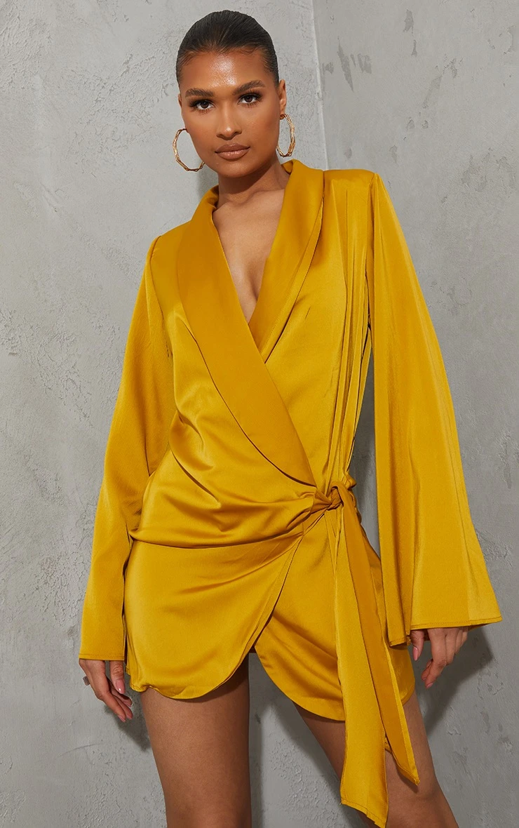 This dress is sure to give your look a luxe touch. Featuring a chartreuse material with a wrap over design, tie fastening and long sleeves. Style this with heels and complete the look with your go-to accessories.