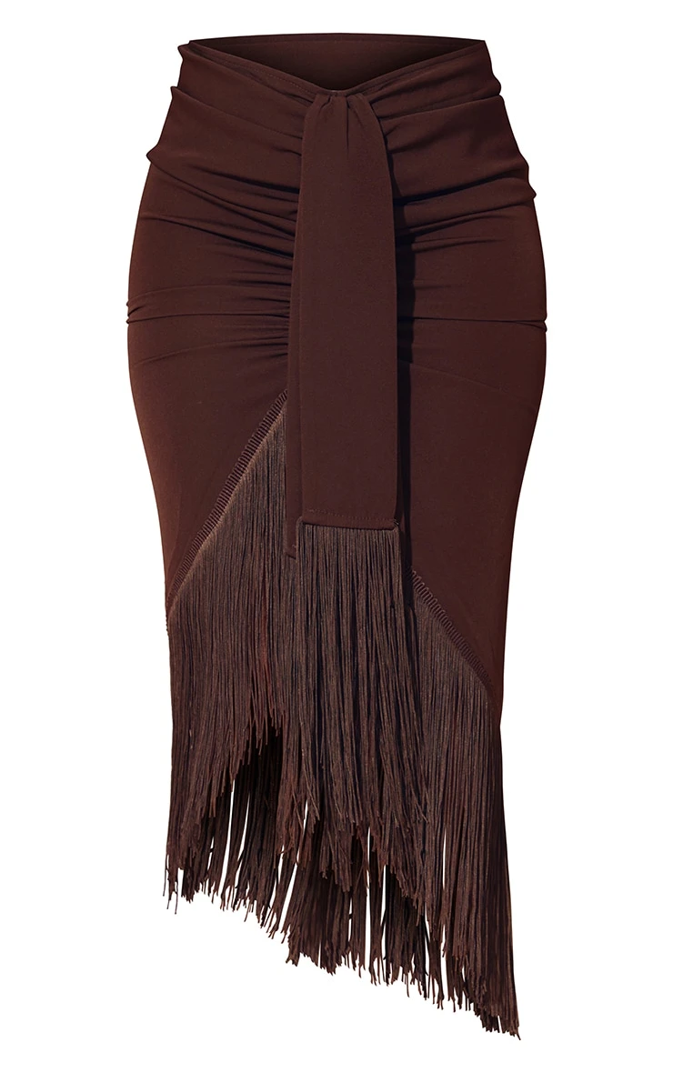 Hit refresh on your weekend wardrobe with this must-have skirt. Featuring a chocolate brown material with a tassel hem design and a midi length. Style with a bandeau top and clear heels for a chic, date night fit.