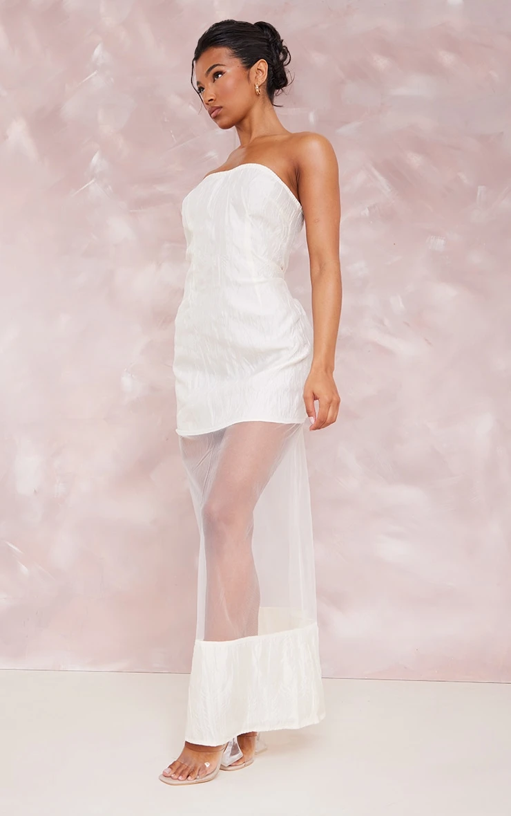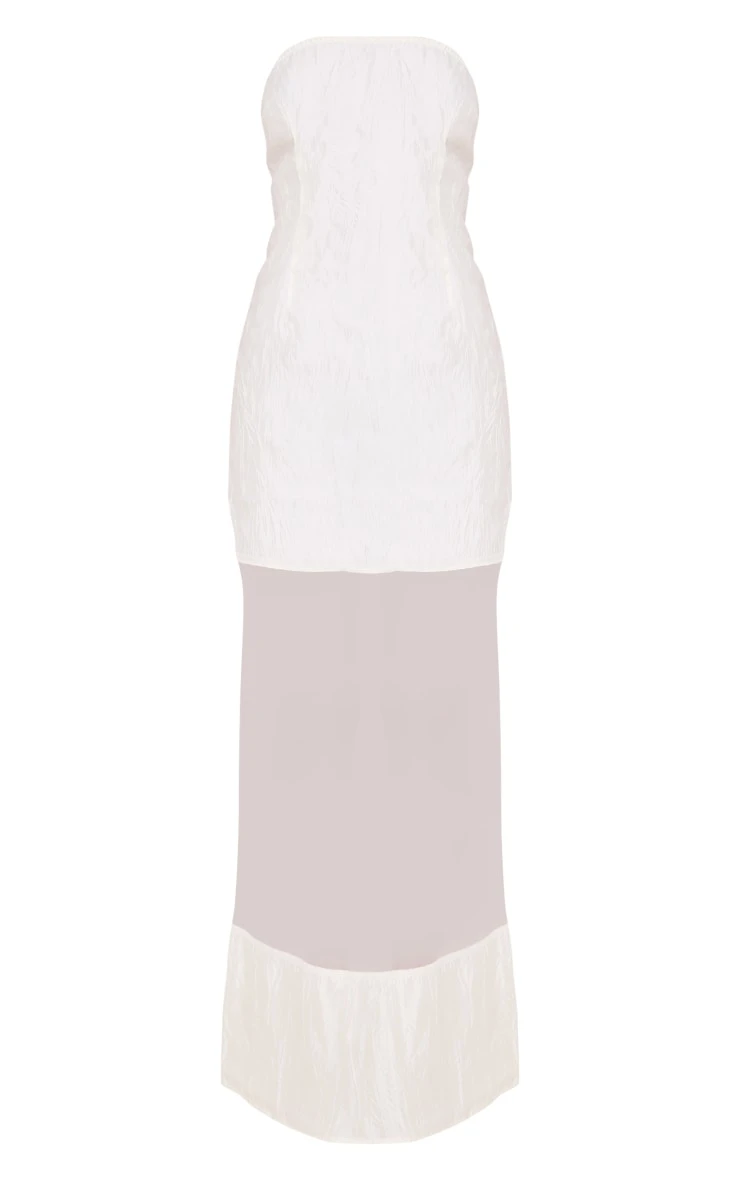 We are obsessing over this cream textured chiffon mesh detail bandeau maxi dress for your collection doll. Brought to you in a cream textured material, with a chiffon design and mesh detail, this maxi dress will have you bringing all the luxe vibes to your next upcoming occasion. This bandeau dress will have you standing out from the rest no matter what. Team with some clear heels and gold accessories to complete the look.