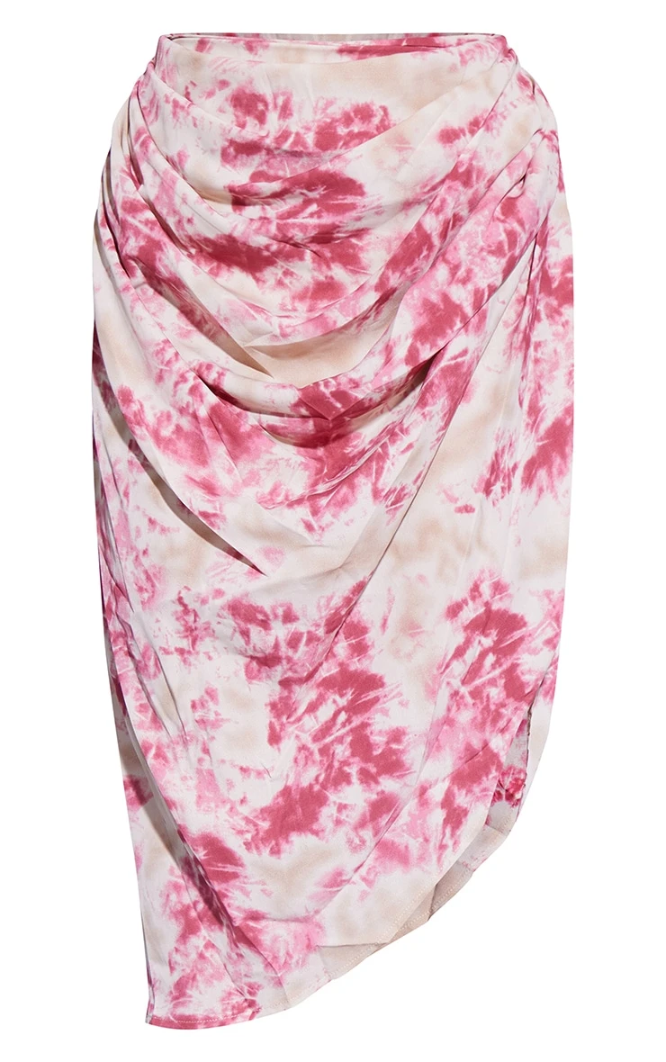 Steal all of the stares in this dreamy co-ord skirt. Featuring a fuchsia tie dye material with a ruched side and midi length, wear with the matching corset top and complete the look with high heels and statement accessories.