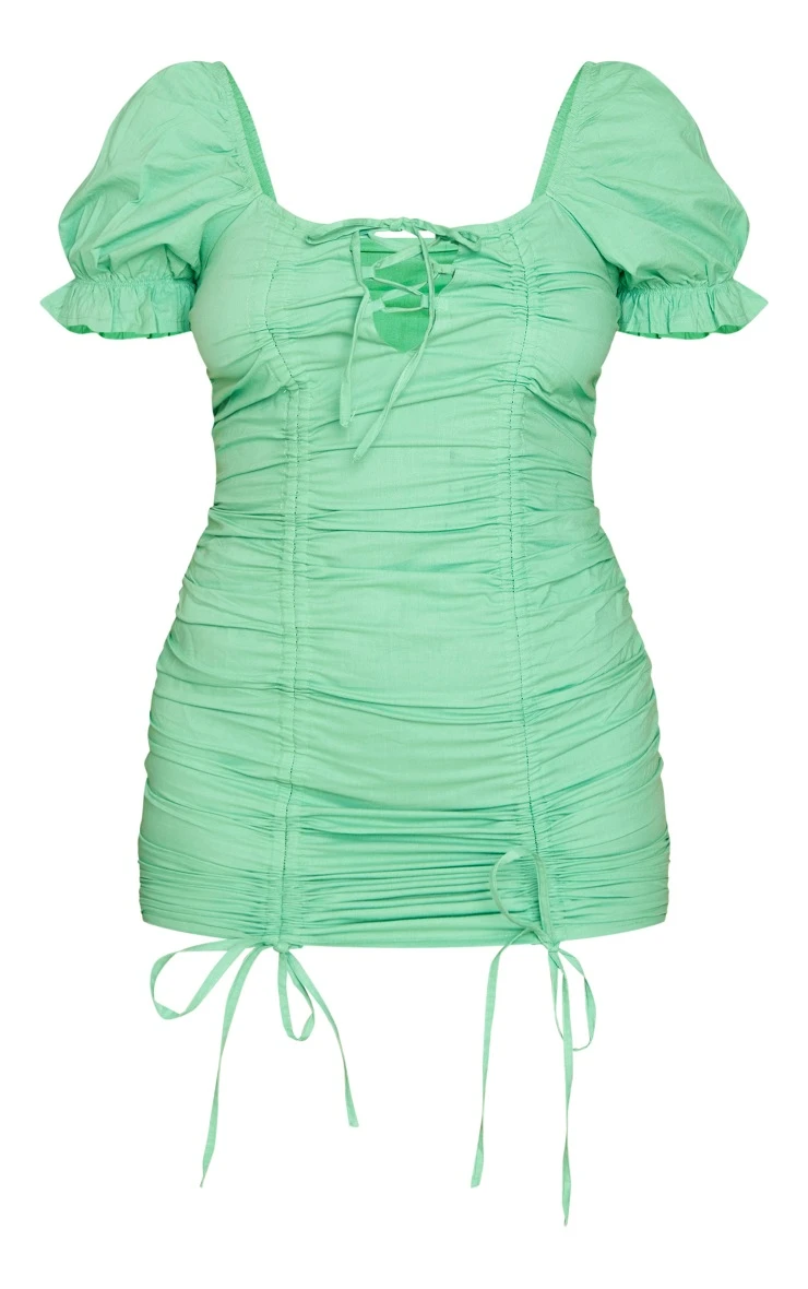 Brighten up your new season wardrobe with this green lace up ruched puff sleeve bodycon dress. Brought to you in a bold green hue material with a ruched design, puff sleeves and lace up detailing, what more could you ask for? Keep it casual and style this bodycon dress with fresh kicks and your go-to accessories for a fierce off-duty ‘fit, or why not add heels for more of a weekend vibe?