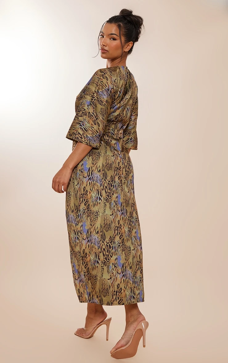 Your what-to-wear dilemmas have been answered with this khaki animal print satin batwing plunge split midaxi dress. With a khaki animal print satin material, batwing design, and a split hem, you are sure to impress. No matter what your plan are, whether they are a romantic date night or a get-away in the sun, this midaxi dress is just what you need. Team with clear heels and gold accessories for a chic finish.