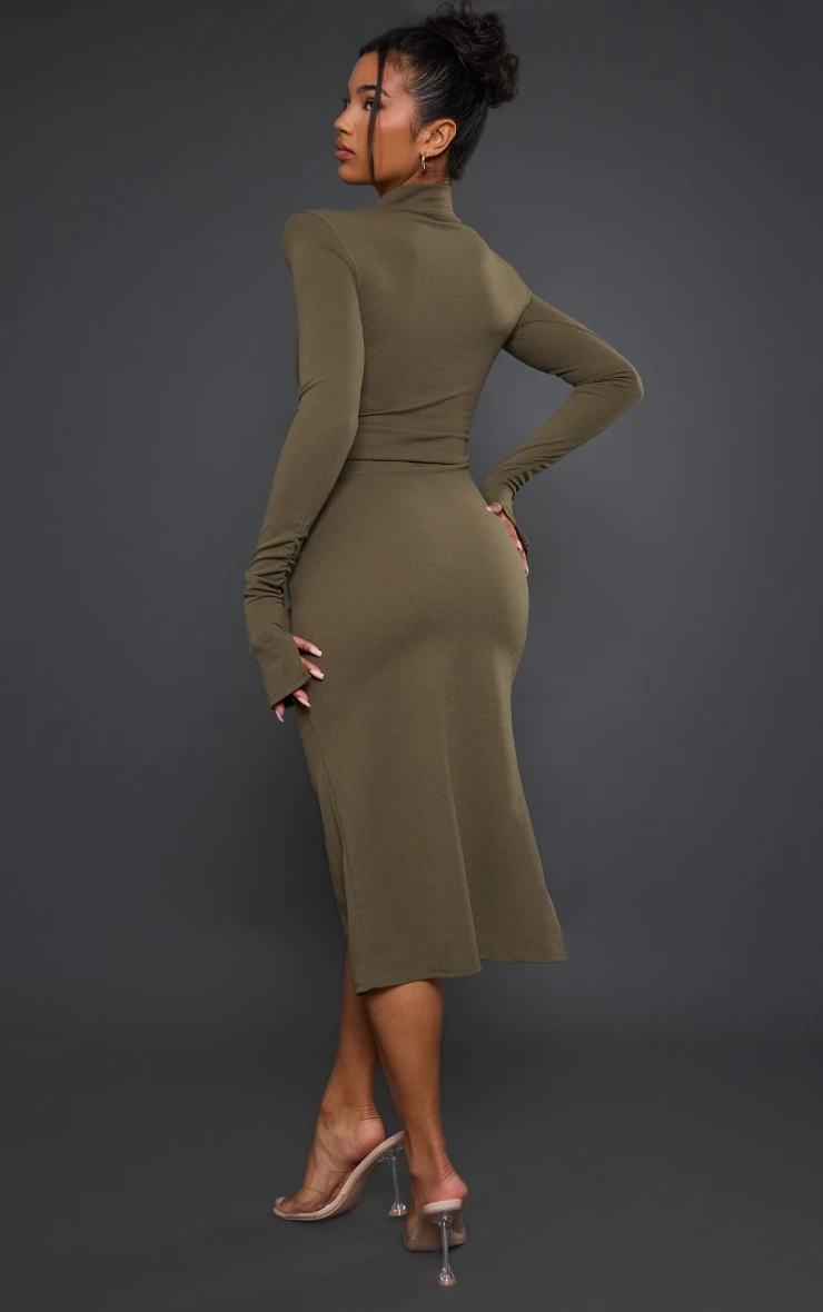 Turn up in style this season with this khaki crepe high neck split sleeve midi dress doll. It’s perfect for any occasion. Made using a khaki hue crepe material with a midi length and a figure-worshipping fit that will hug all the right places, what more could you ask for? Simply team with high heels, gold hue accessories and a shoulder bag for a vibe that will get everyone talking this weekend.