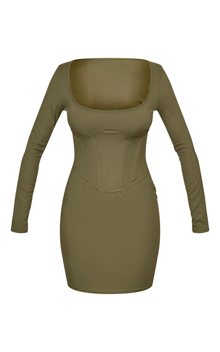 Update your new season wardrobe with this khaki rib corset seam square neck mini bodycon dress it’s a must this season doll. This bodycon dress features a khaki hue rib material with a square neck, a mini length and a figure-flattering fit, it’s a yes from us. Team this with knee high boots and a leather jacket for the ultimate combo this season doll.