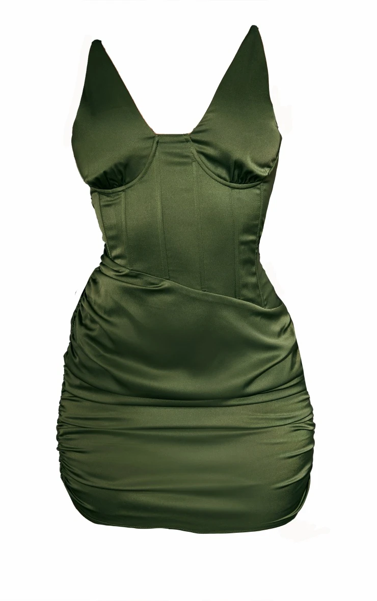 Get ready to serve nothing but style with this khaki satin plunge detail ruched skirt bodycon dress. You are sure to make heads turn with this staple piece. Made using a khaki hue satin material with a plunge neck, ruched detailing and a figure-flattering fit that will earn you all the right attention, what more could you ask for? Team with high heels, accessories and a shoulder bag for a look that won’t disappoint.