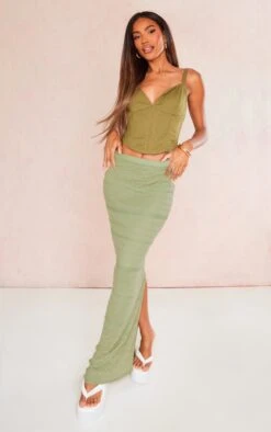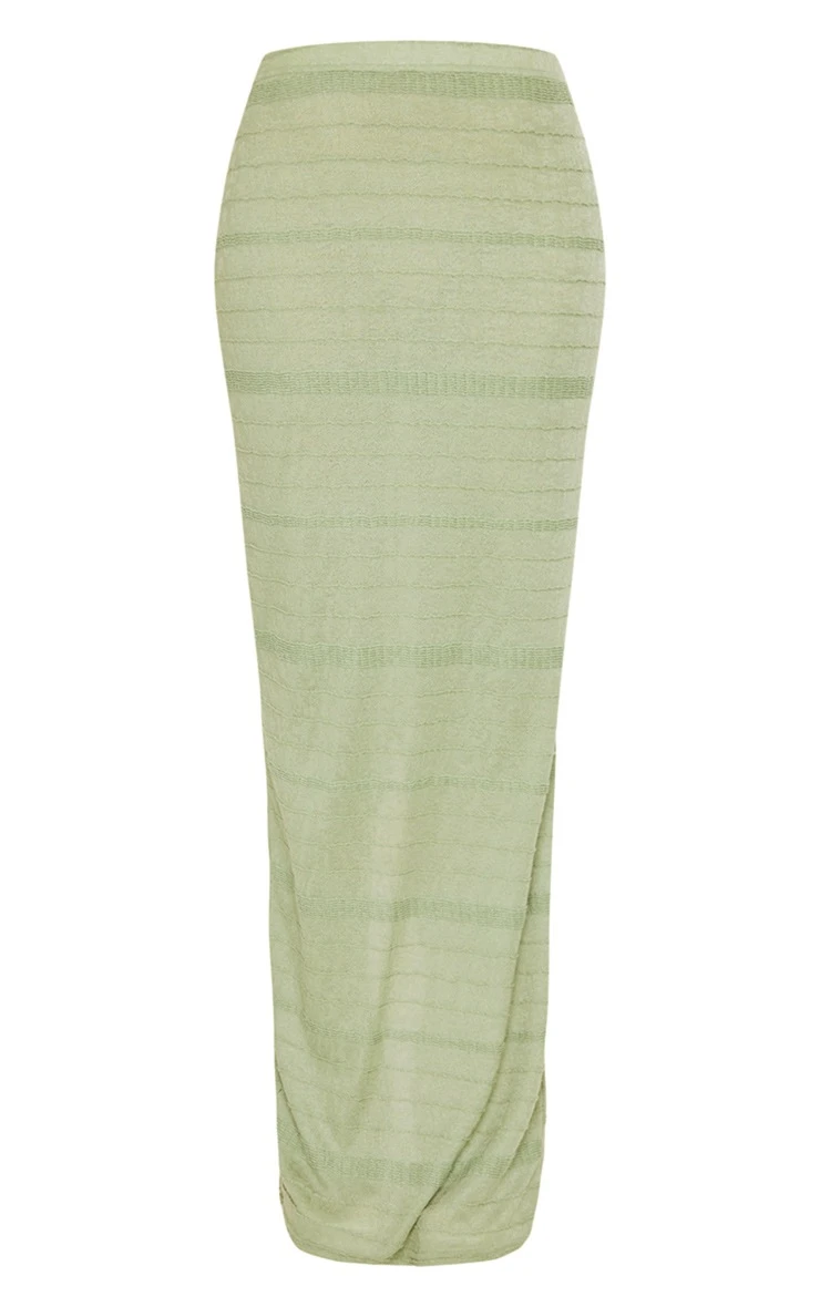 Add some dreamy hues to your new season wardrobe with this khaki sheer textured split back maxi skirt. Brought to you in a khaki hue sheer textured material with a split back design and a flattering maxi fit, we just can’t get enough. Style this maxi skirt with a corset top, flatform sandals and simple accessories for a weekend look that will steal the stares no matter what your plans.