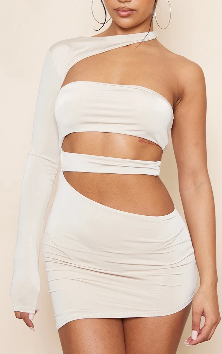 Your glam collection needs this eyecatching stone slinky one shoulder cut out mini dress doll. It’s the perfect staple for all those upcoming occasions. Made using a stone hue slinky material with a cut out design, a mini length and a figure-flattering fit that is sure to show off that unreal shape, what more could you ask for? It gets a yes from us. Wear with gold hue accessories, a mini bag and high heels for a simple yet chic ‘fit that can’t be matched.