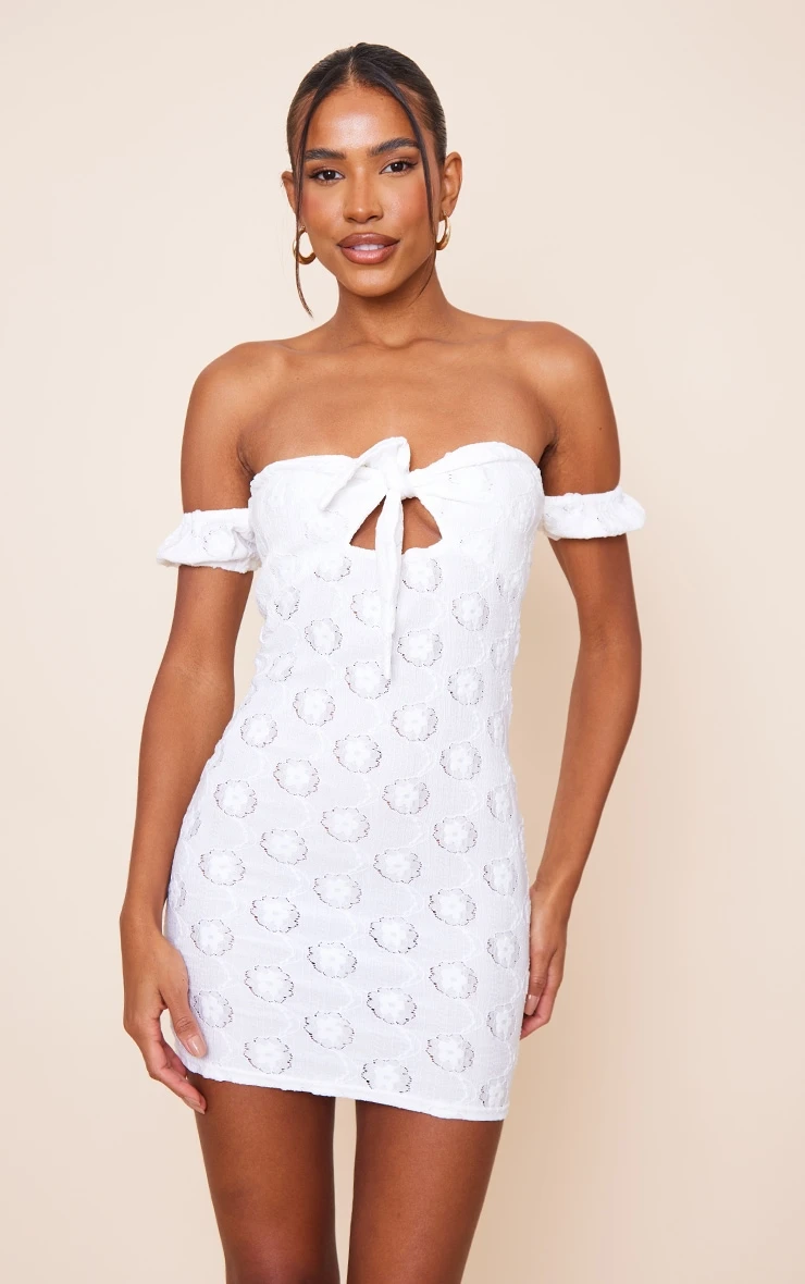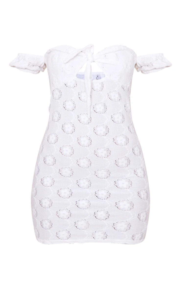 Enter the new season in style with this white broderie tie bardot bodycon dress. Brought to you in a white hue broderie material with tie detailing, a bardot neckline and a figure-flattering bodycon fit, how can you not fall in love with this dress doll. Just add matching hue heels and statement accessories for a look that is sure to have all eyes on you wherever you go doll.