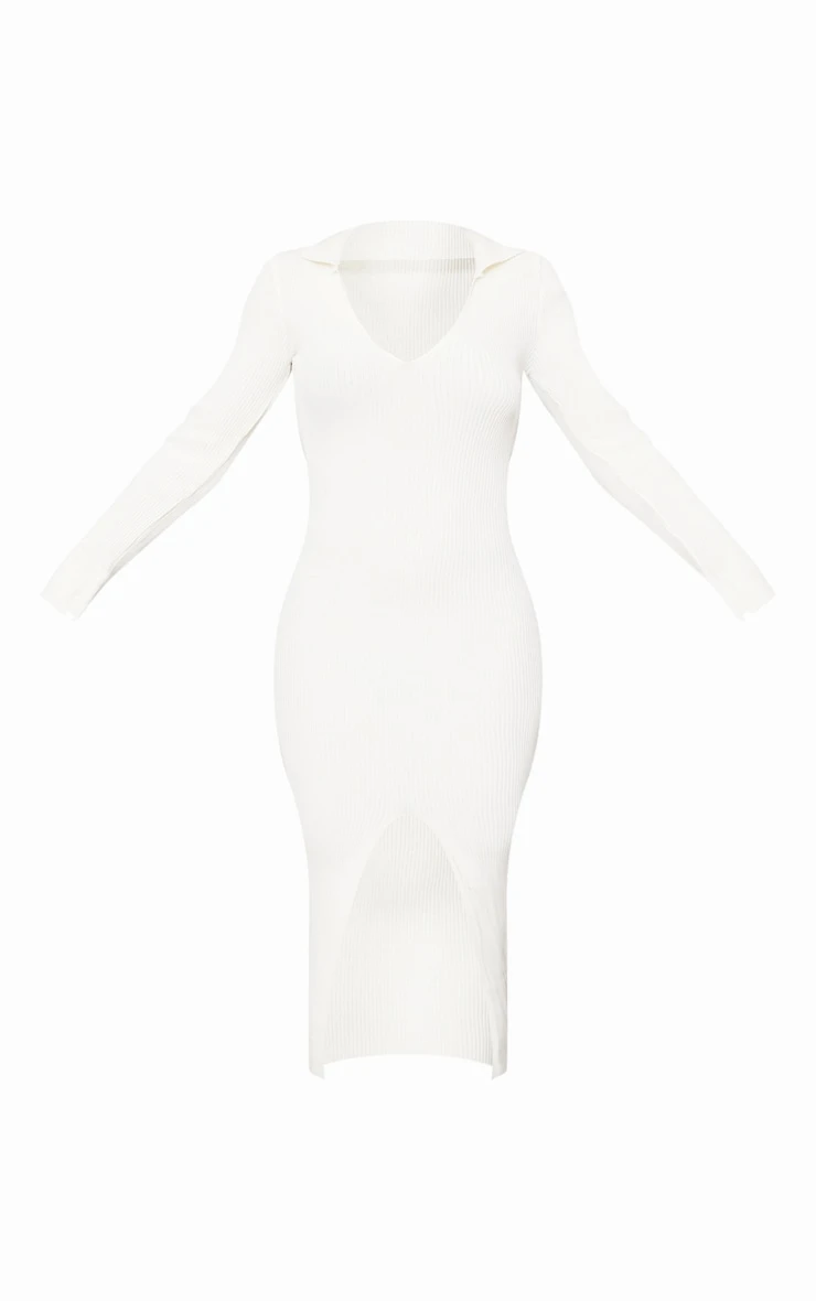 Look all kinds of glam on your off-duty days with this white collar rib knit midaxi dress. Its white rib knit material adds all the cosy feels whilst its collar gives you that chic finish. This midaxi dress has a plunging neckline and a figure-hugging fit that will show off your unreal shape. Give your off-duty look a dreamy finish with boots, gold accessories, and a shoulder bag.