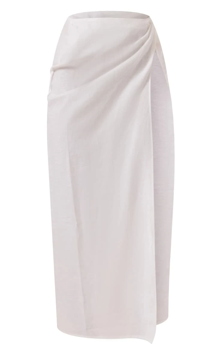 Channel all the glam vibes into your new season wardrobe with this white linen look knot front extreme split maxi skirt, it is sure to be your new go to for your next date night and beyond. This skirt features a white linen look material with a knot front design and an extreme split detail, how could you not be in love? Style this maxi skirt with a basic top, strappy heels and your fave accessories for a flawless finish.