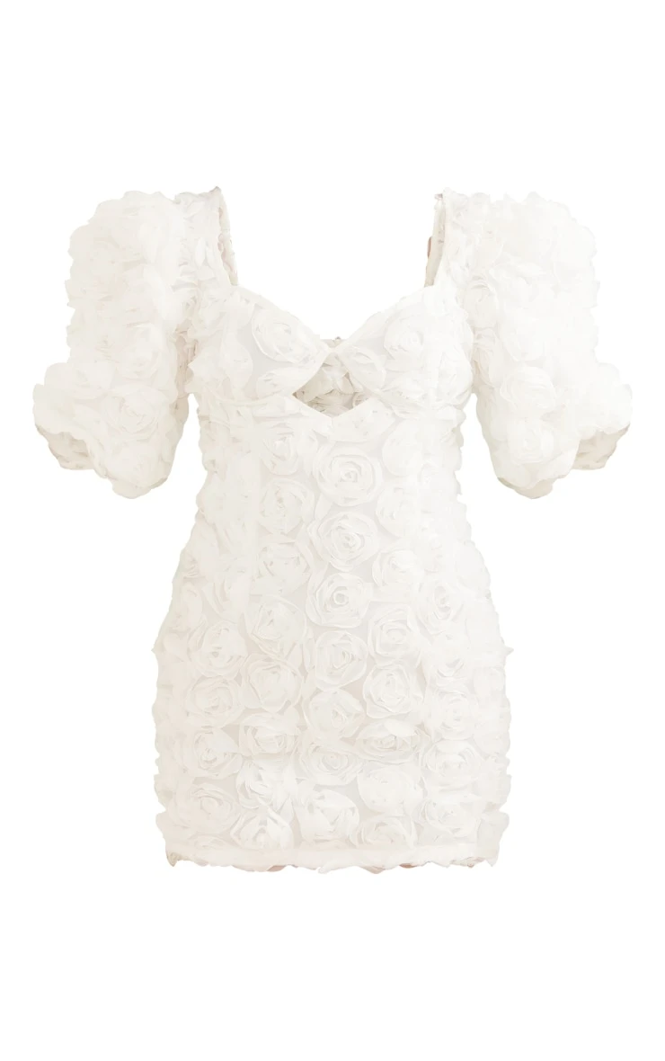 Get ready to look all kinds of glam in this unreal white rose applique puff sleeve cup detail bodycon dress, it is the perfect piece for your next date night and beyond. This dress includes a white material with a rose applique detail that will bring all the luxe vibes. With a bardot design and a figure-flattering fit, get ready to show off your confident side. Style with your fave heels and minimal accessories for a flawless finish.